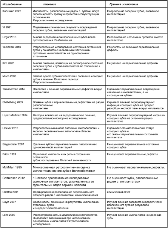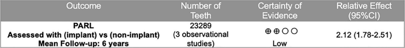 Хотя результаты этого систематического обзора дают представление о влиянии имплантатов на периапикальное состояние соседних зубов, необходимы дальнейшие исследования для изучения причинно-следственных механизмов и уточнения оценки рисков в имплантологической стоматологии. Из 6 включенных исследований было проведено 4 ретроспективных исследования, 1 перекрестное исследование и 1 проспективное исследование. Эти наблюдательные исследования считаются более низкими в иерархии доказательств, поскольку они могут быть более подвержены предвзятости и путанице. Таким образом, необходимы рандомизированные контролируемые исследования, чтобы получить полное представление о взаимосвязи между имплантатами и ПД в соседних зубах.